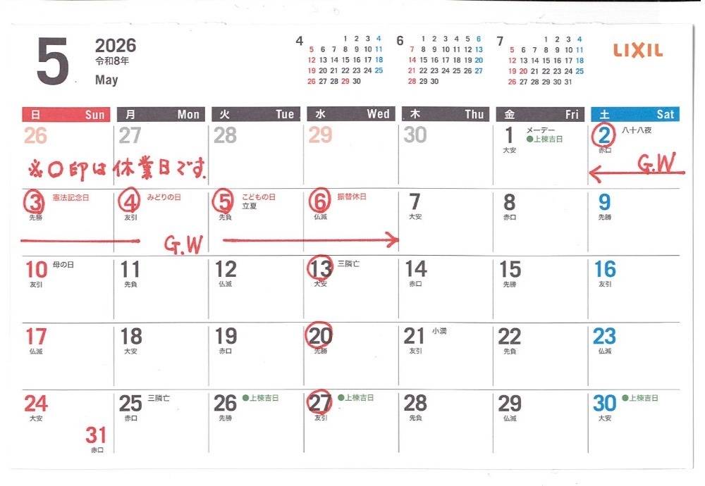 ゴールデンウィーク、5月の営業、休業日のお知らせ